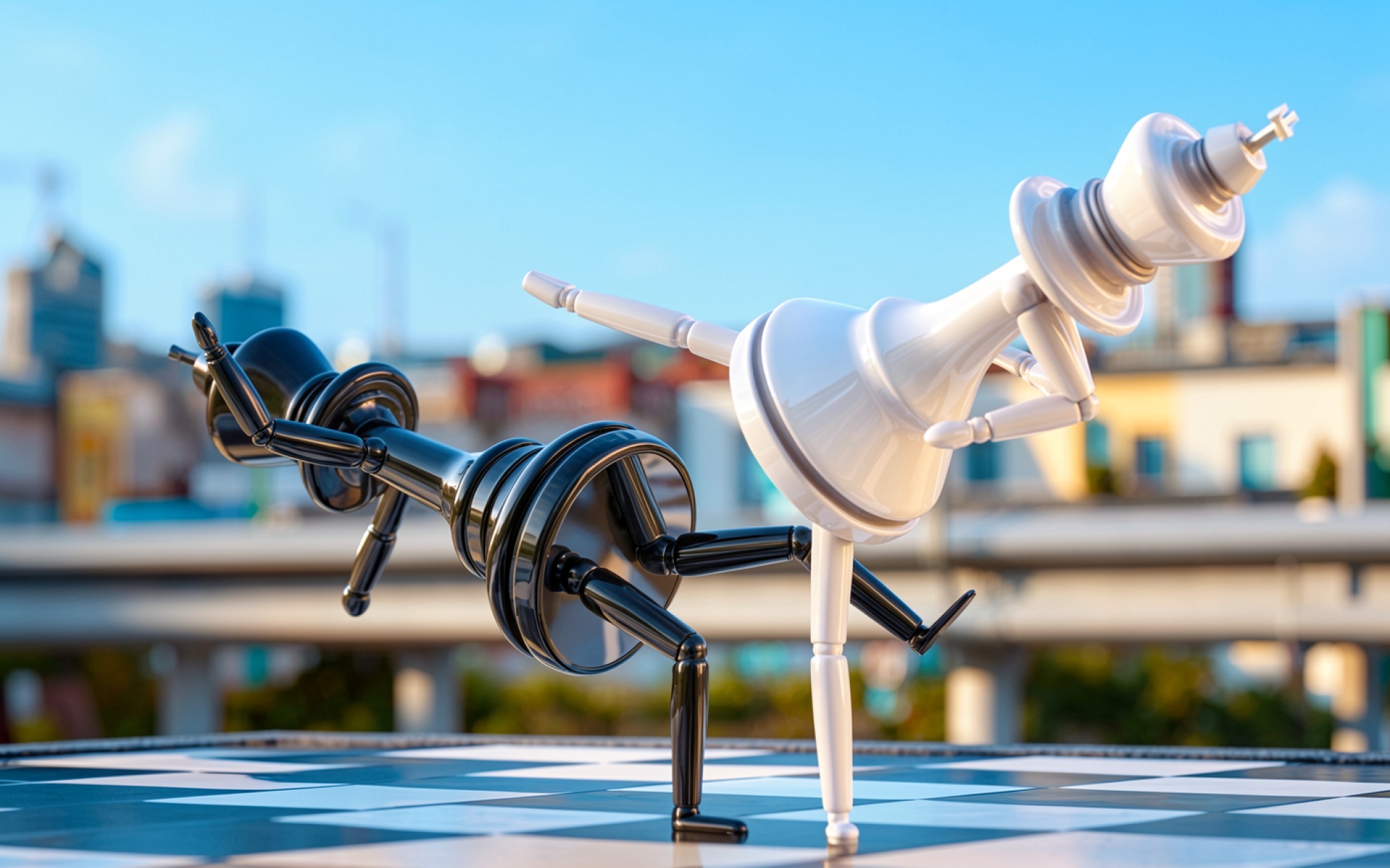 Шахматный король и ферзь в городском пейзаже