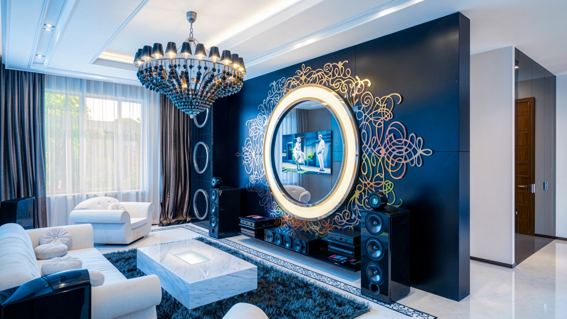 Интерьер гостиной с круглым телевизором и люстрой