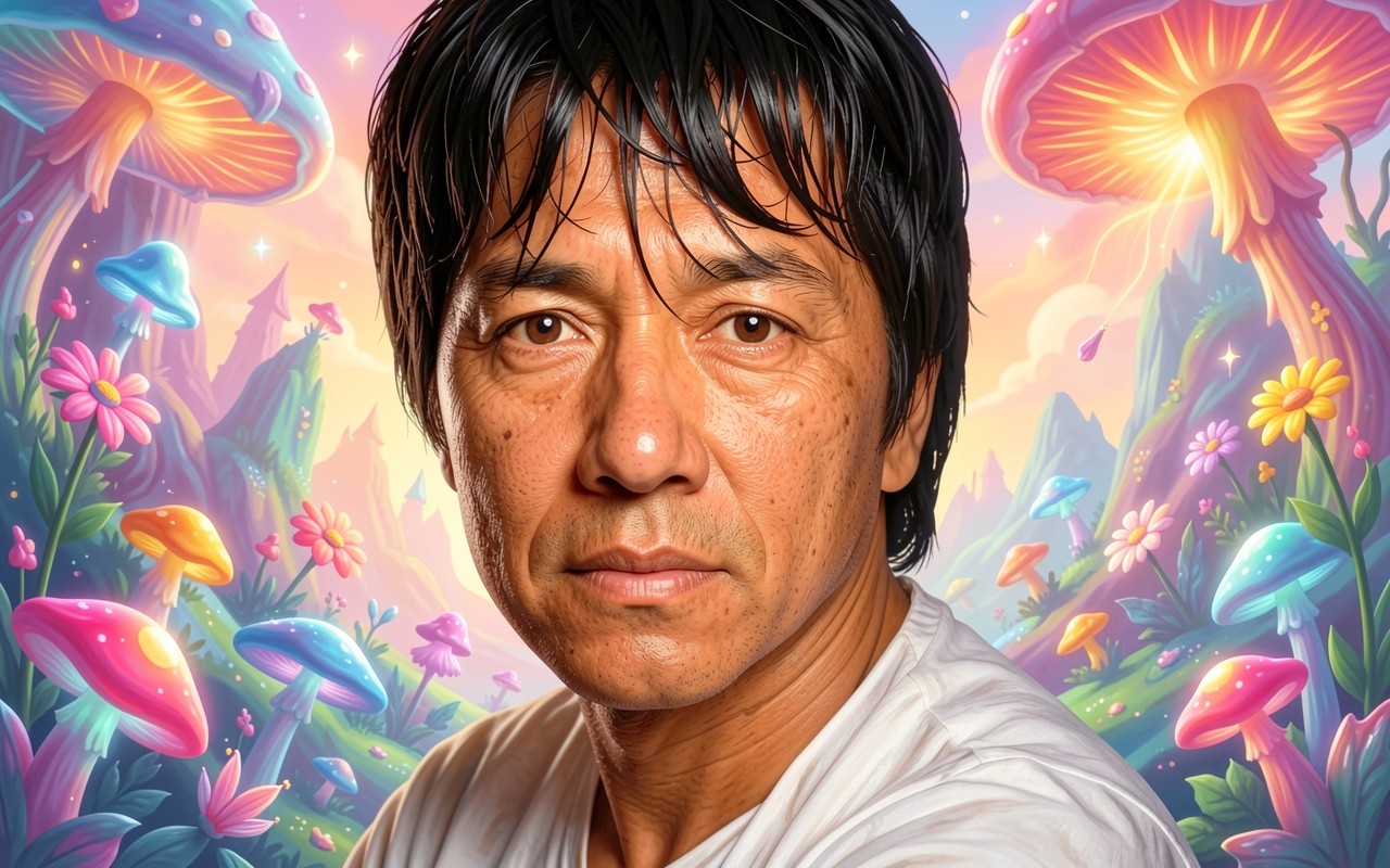 Портрет мужчины в сюрреалистичном лесу с грибами