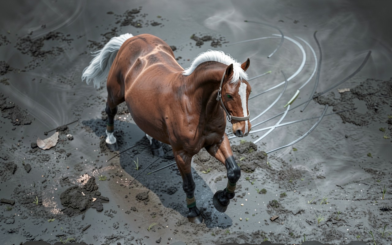 Коричневая лошадь с белой гривой в грязи