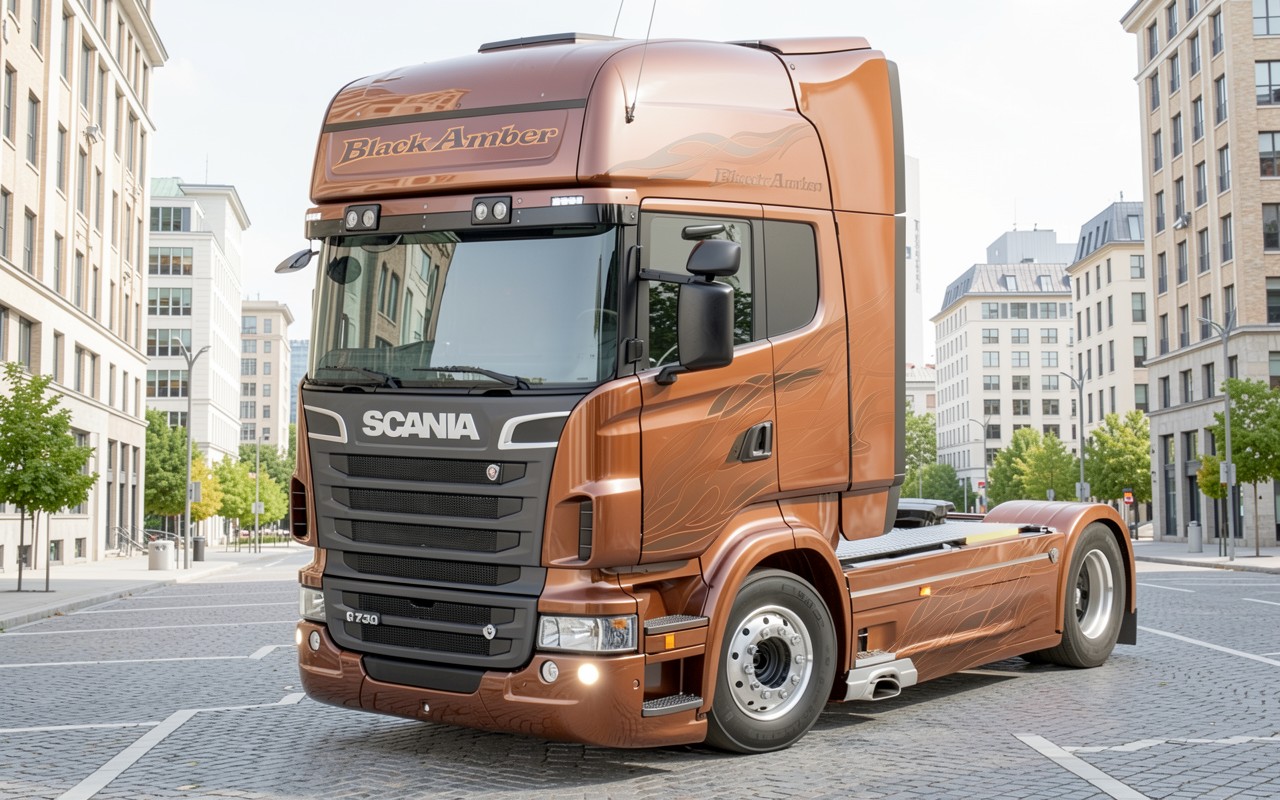 Грузовик Scania медного цвета в городском окружении