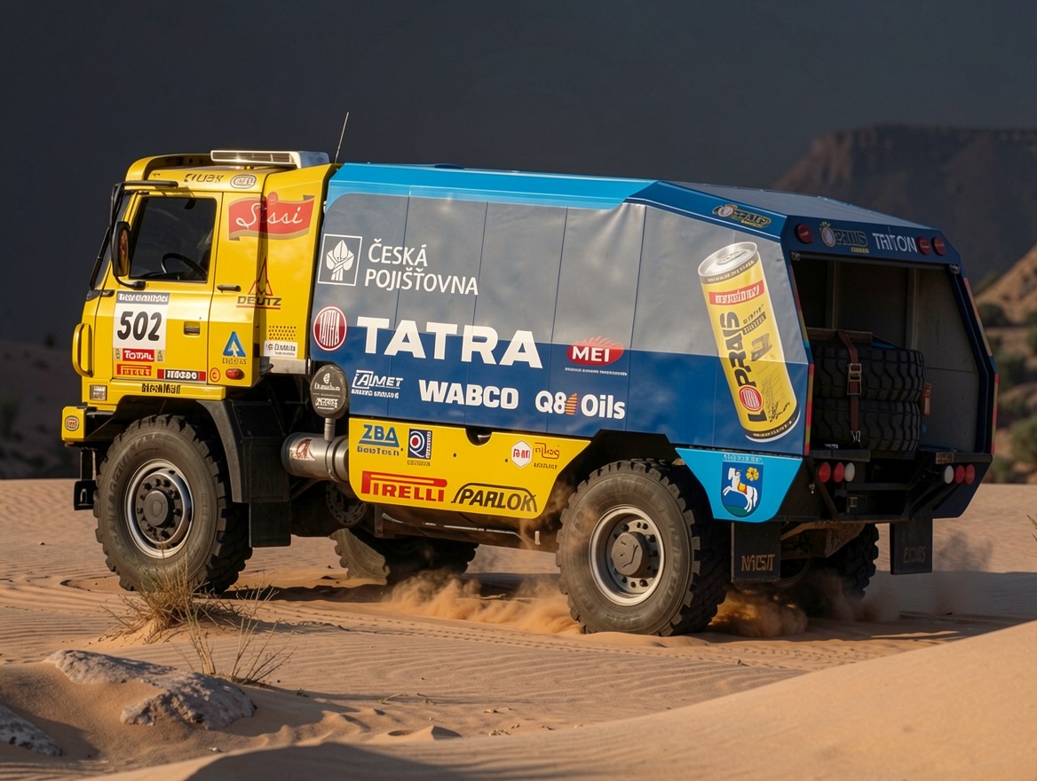 Грузовик Tatra в желто-синих цветах в пустыне