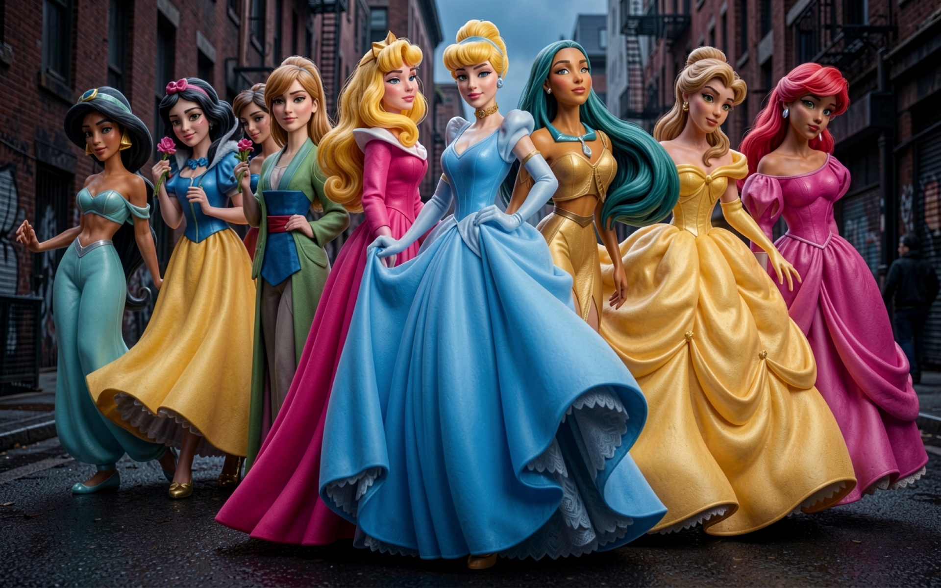 Группа принцесс в пышных платьях на городской улице