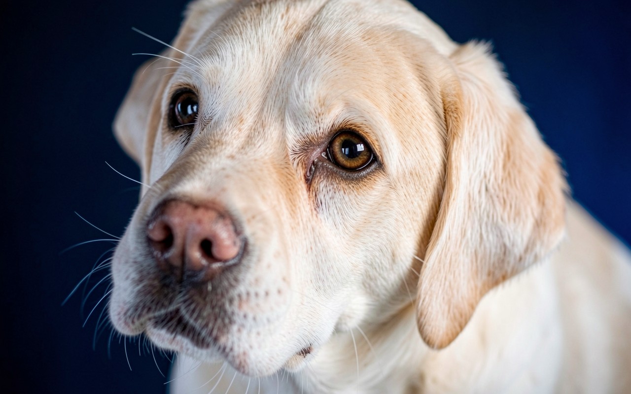 Золотистый лабрадор грустный взгляд темный фон
