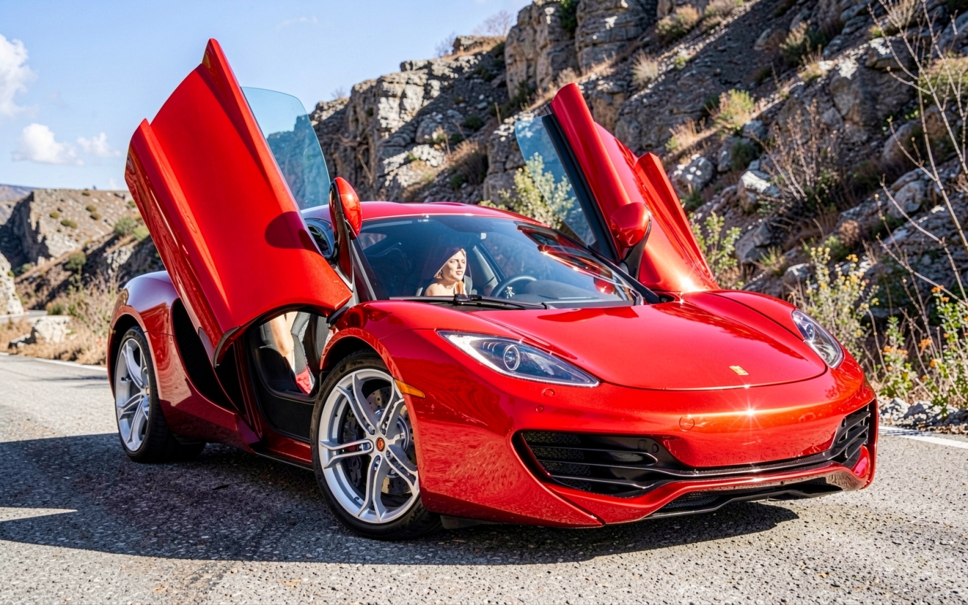 Красный суперкар Ferrari с открытыми дверями в горах