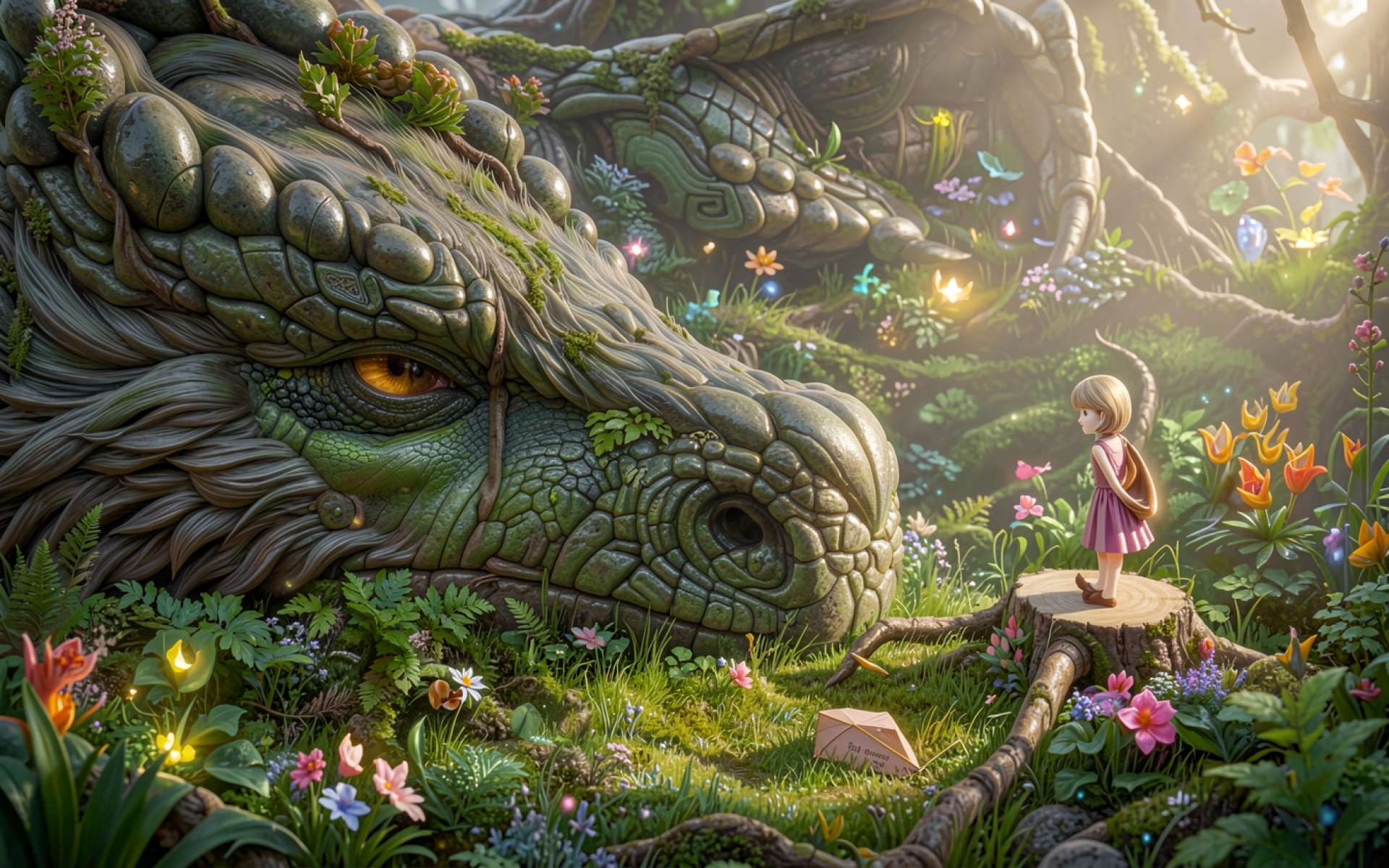 Зеленый дракон и маленькая девочка в лесу