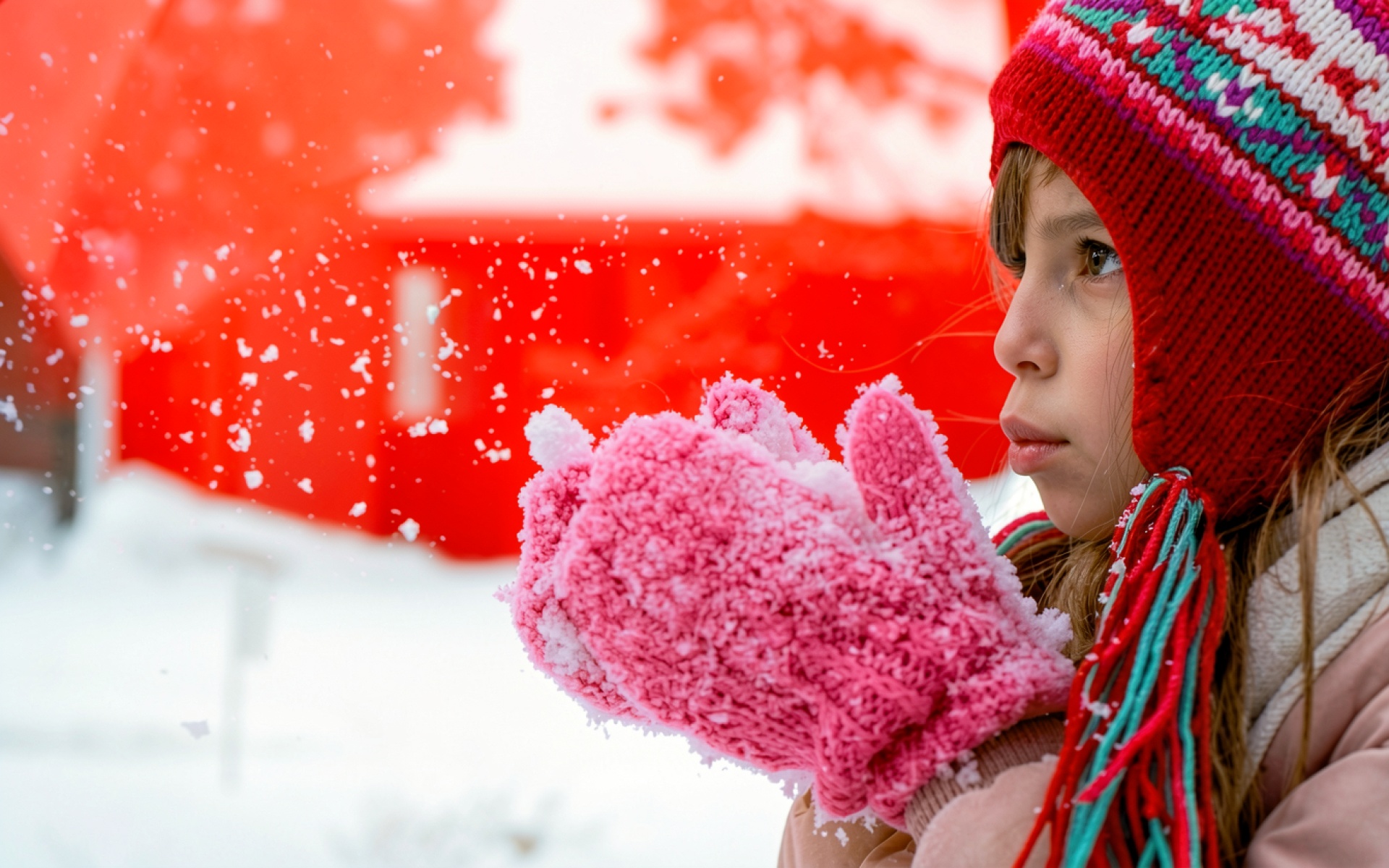 Девочка в розовых варежках на зимнем фоне