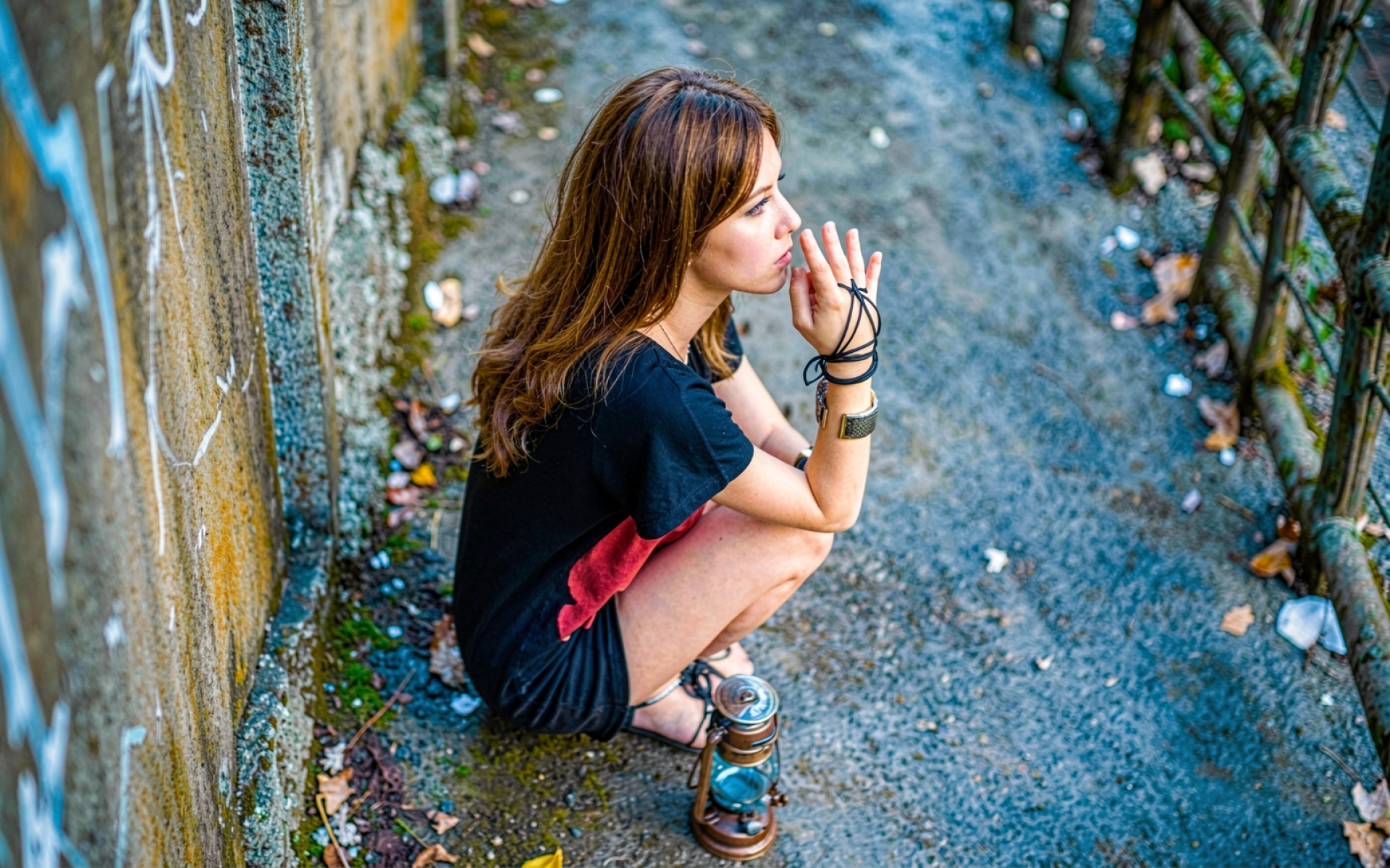 Девушка с керосиновым фонарем в индустриальном коридоре