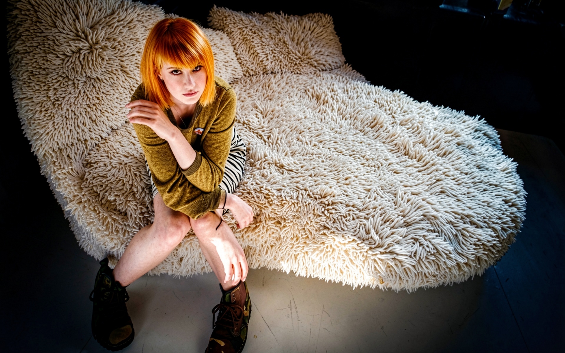 Девушка с рыжими волосами на белом пушистом ковре