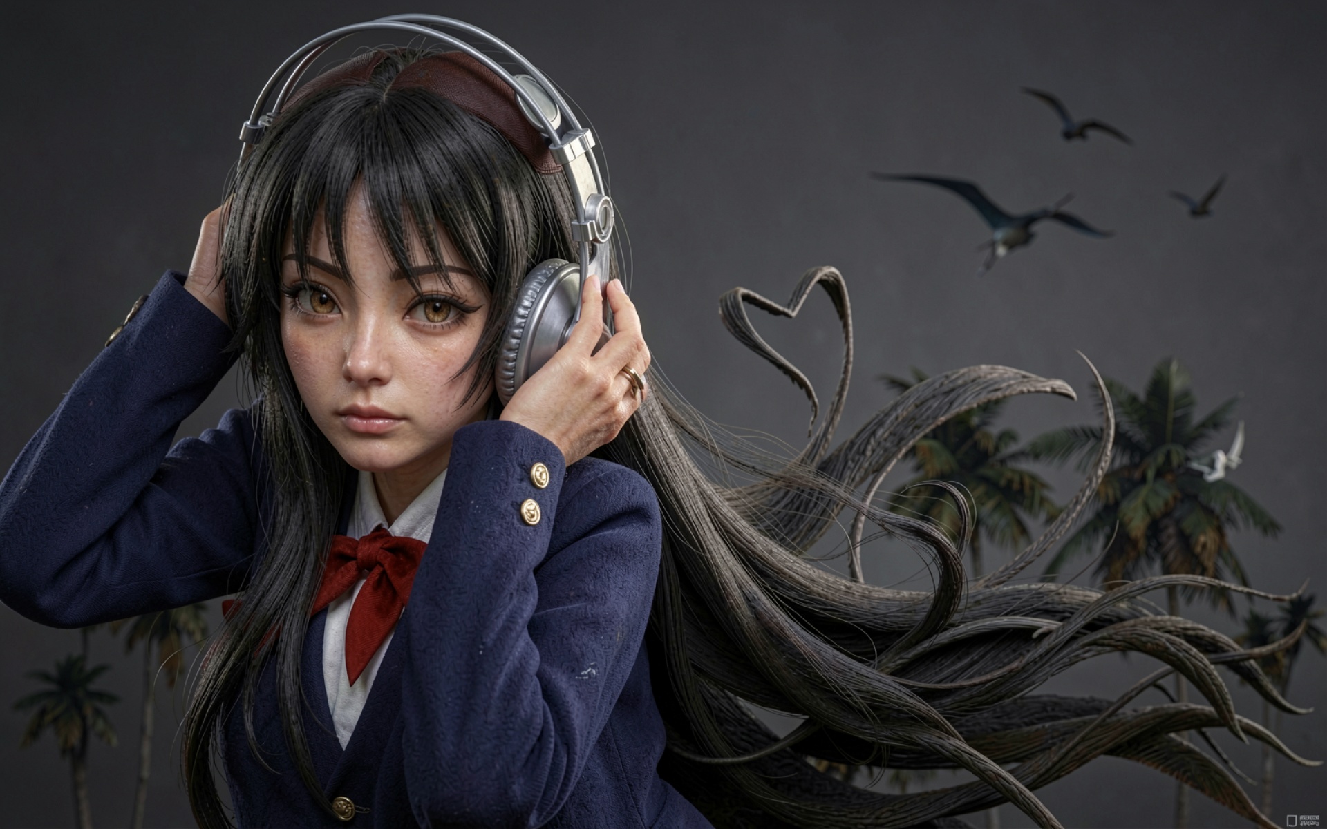 Девушка в наушниках синий пиджак тропики