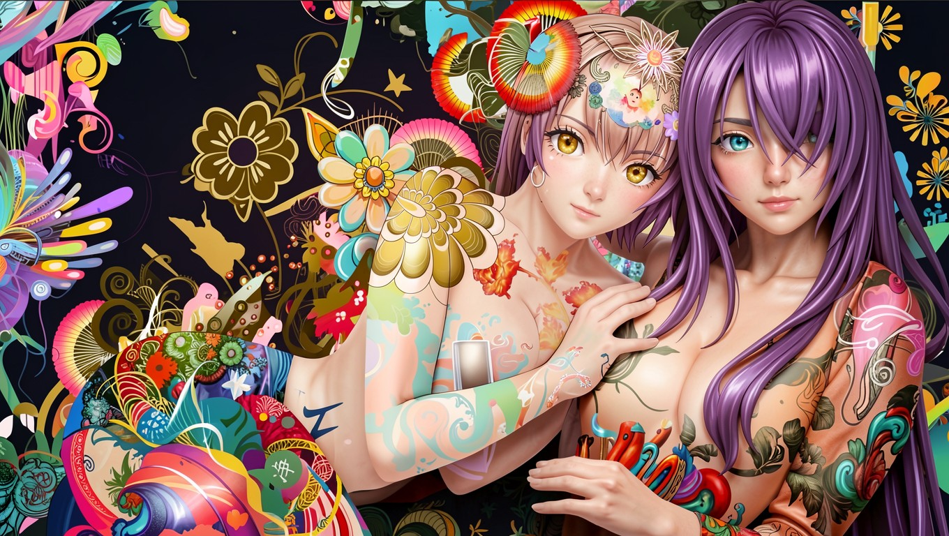 Две девушки с татуировками в стиле аниме