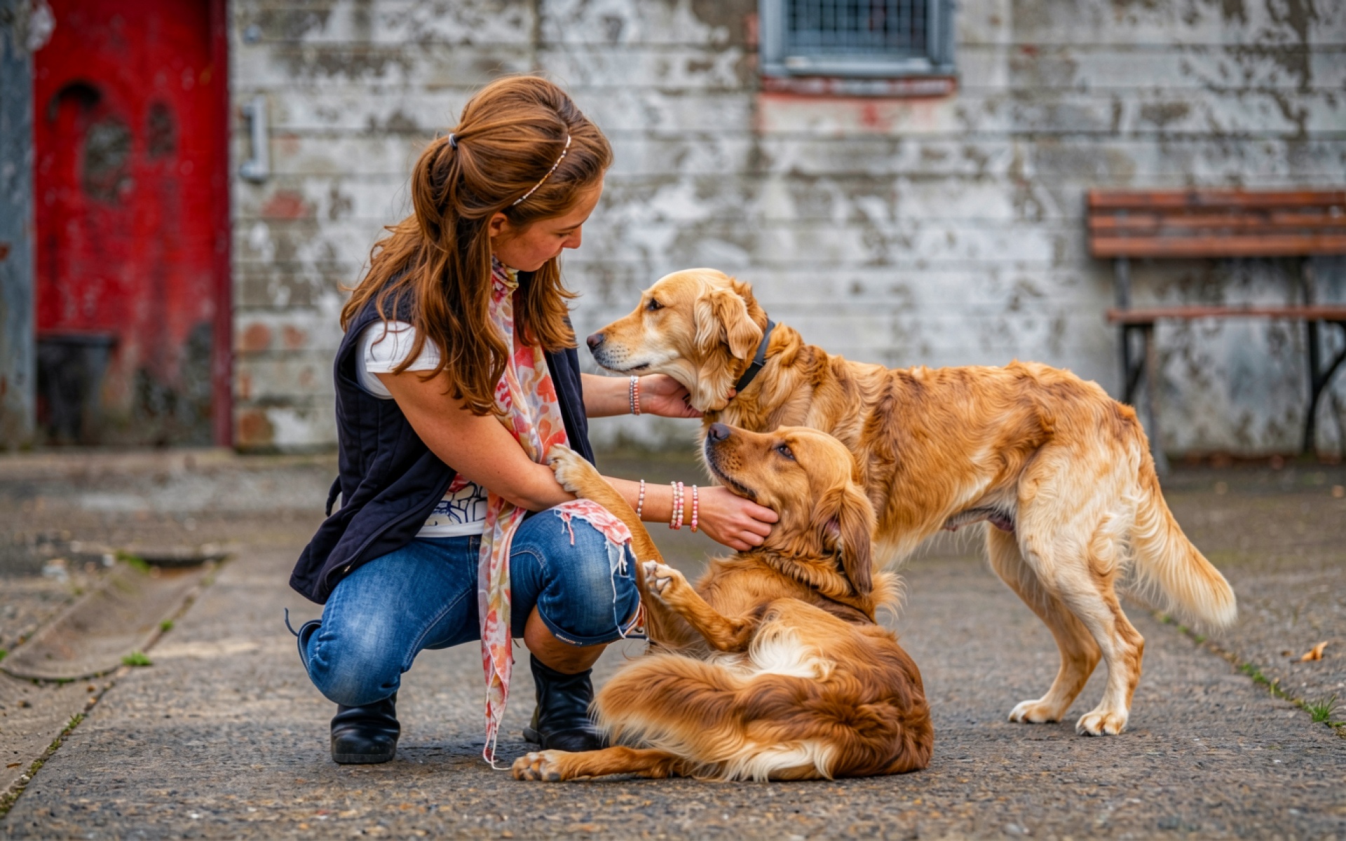 Золотистые ретриверы с девушкой на городском фоне