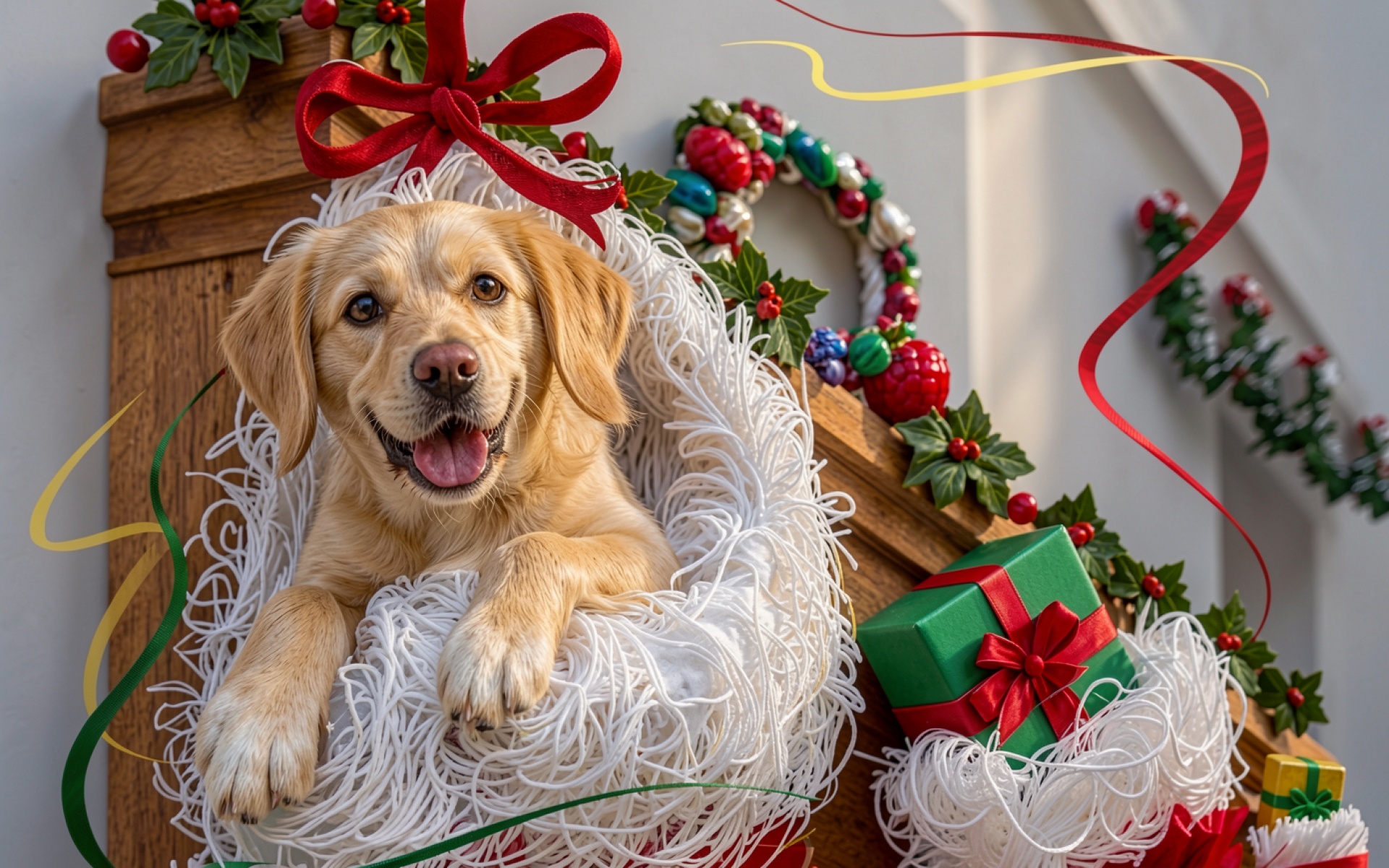 Золотистый ретривер в рождественском декоре с подарками