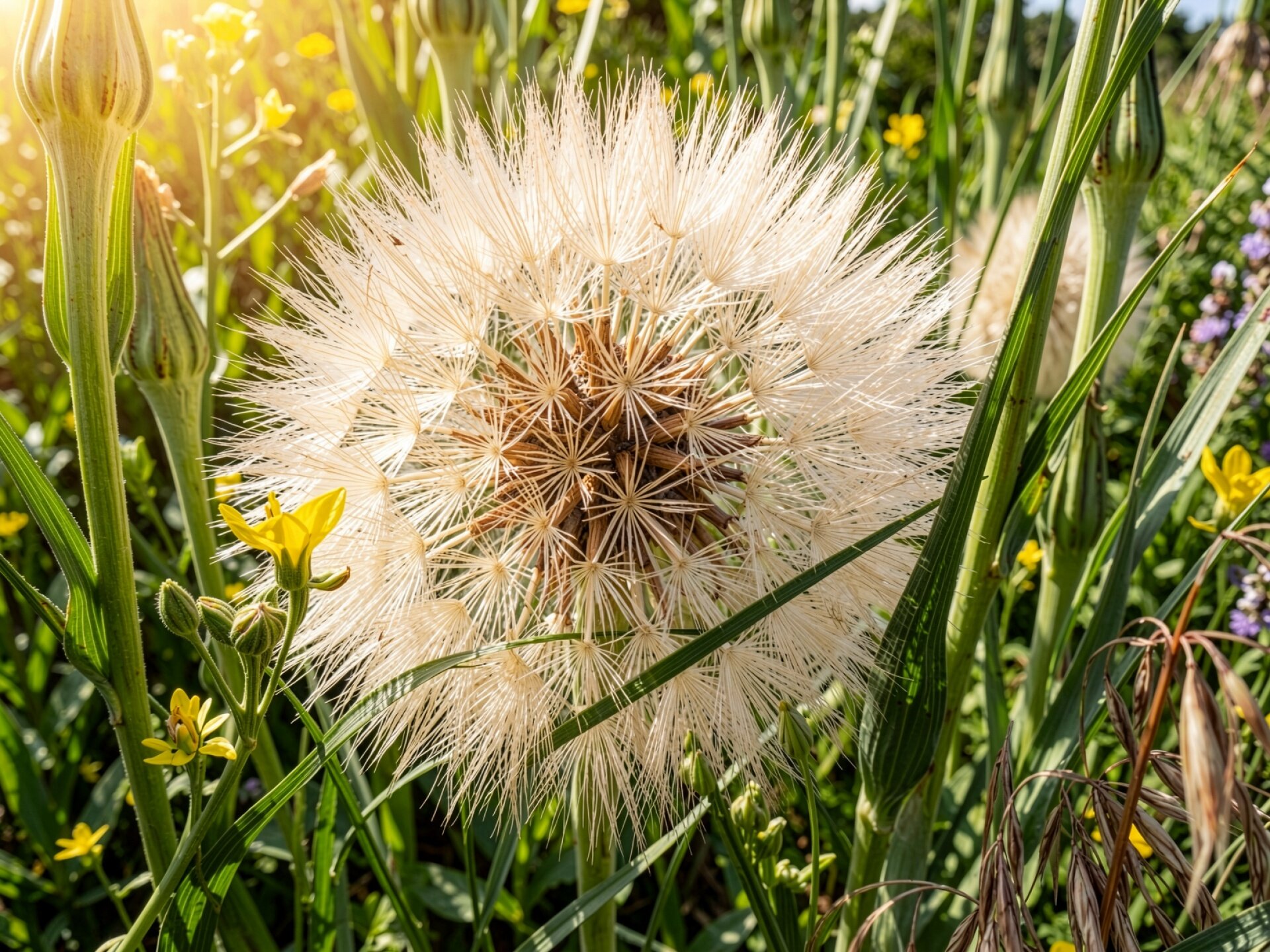 Белый одуванчик в солнечный день на лугу