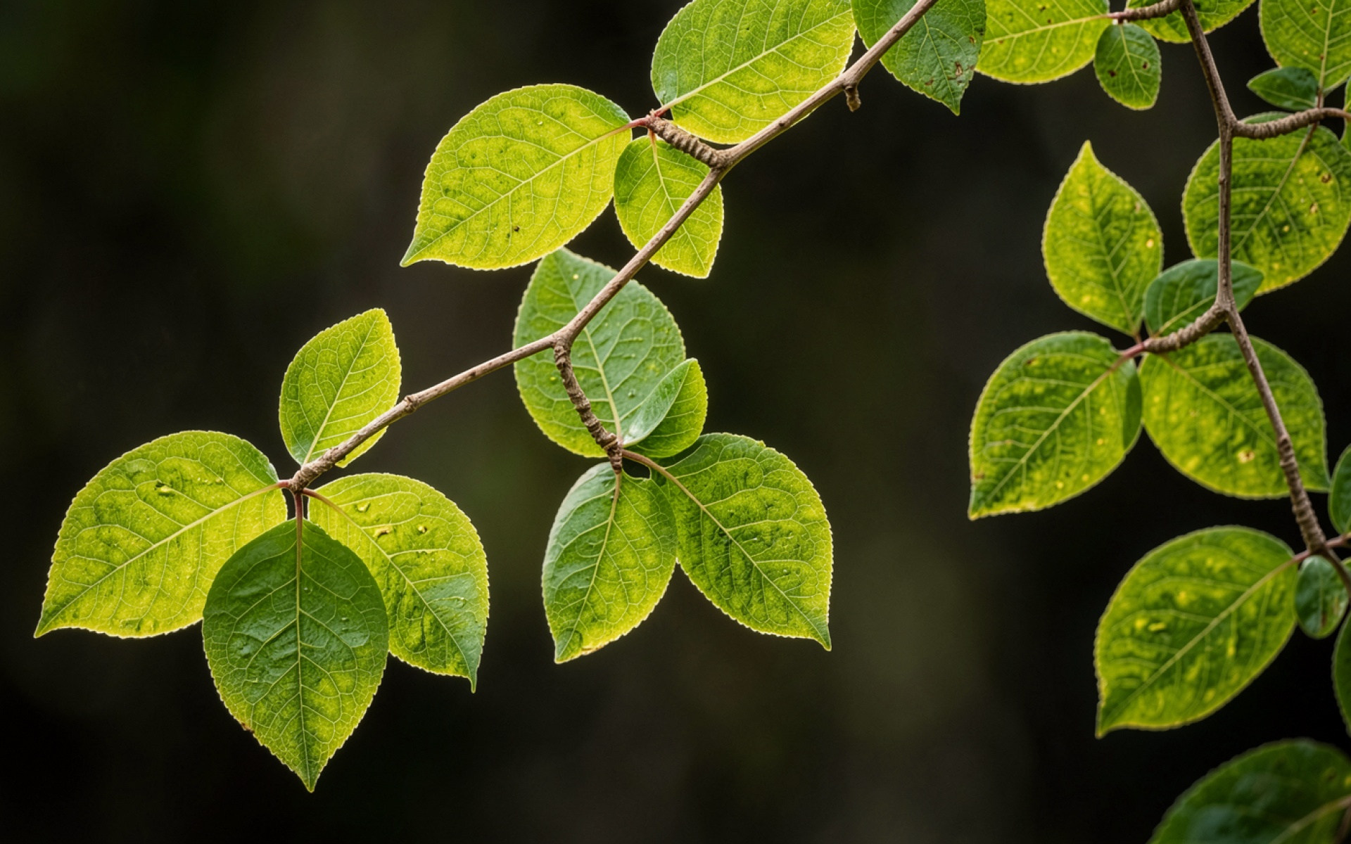 Зеленые листья дерева на темном фоне
