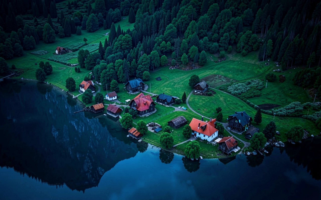 Деревня с красными домами у темного озера