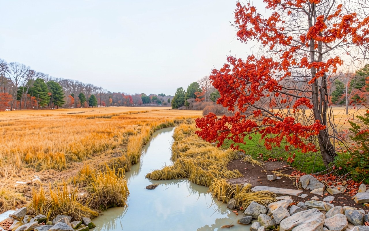 Осенний пейзаж с красным деревом и ручьем