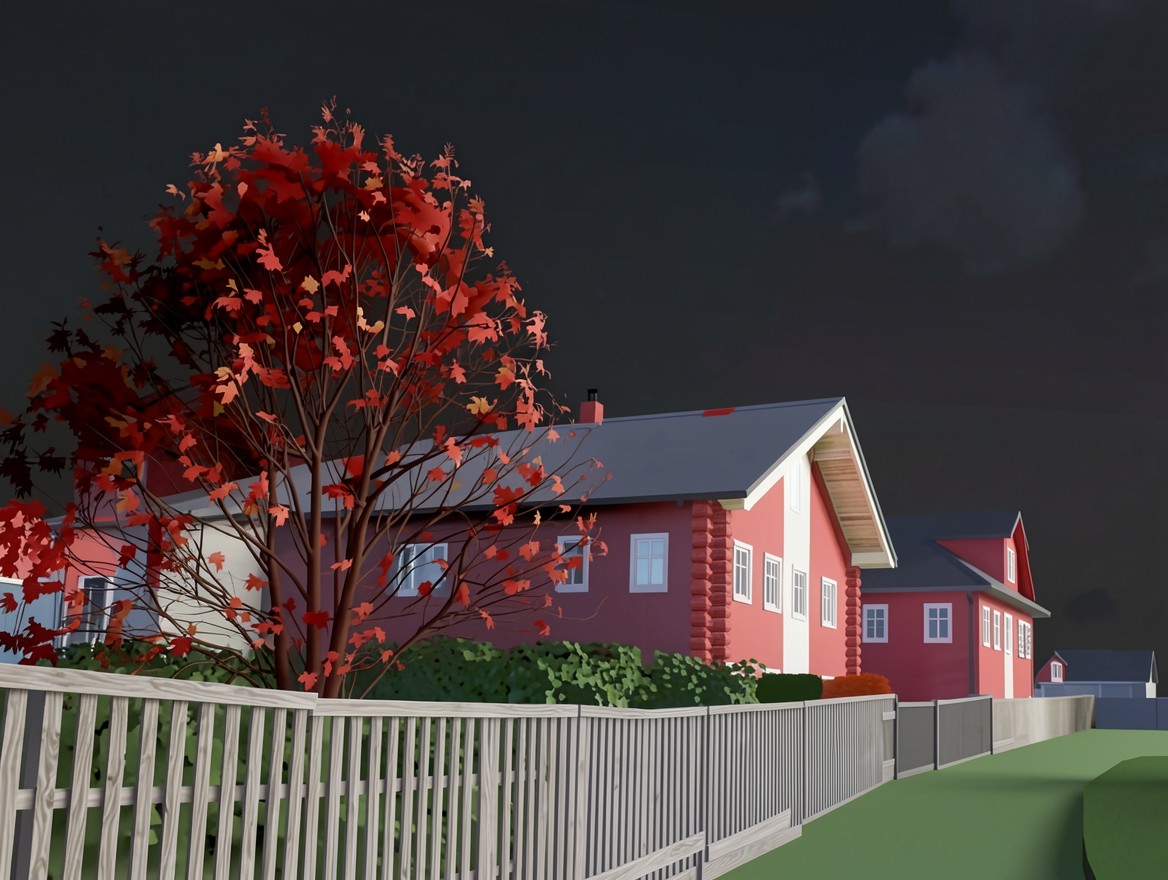 Красный дом с осенним деревом в сумерках