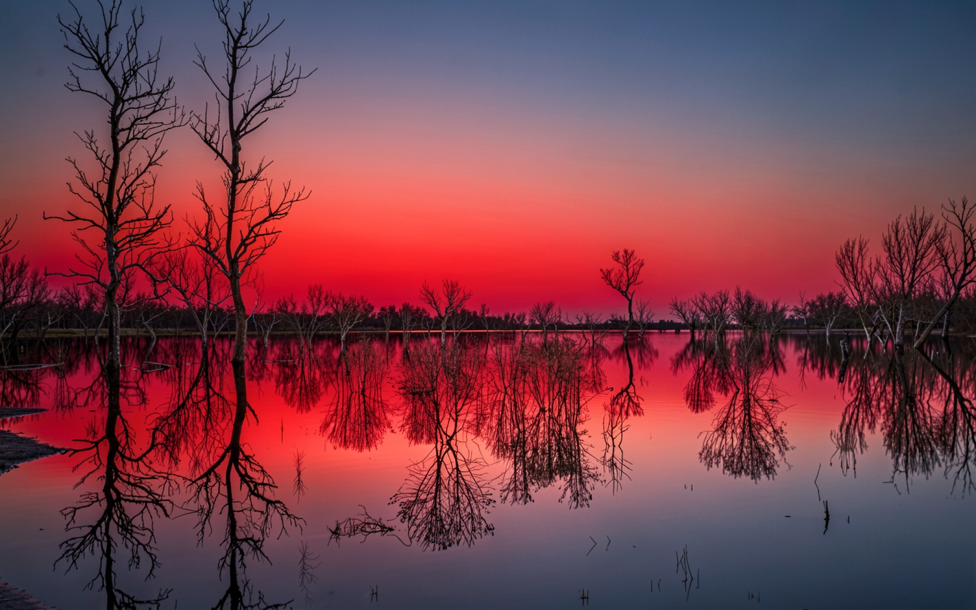 Сухие деревья в красном закатном небе