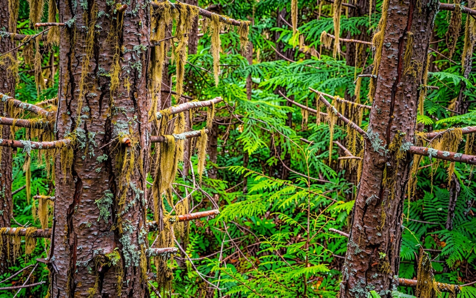 Хвойные деревья с мхом в зеленом лесу