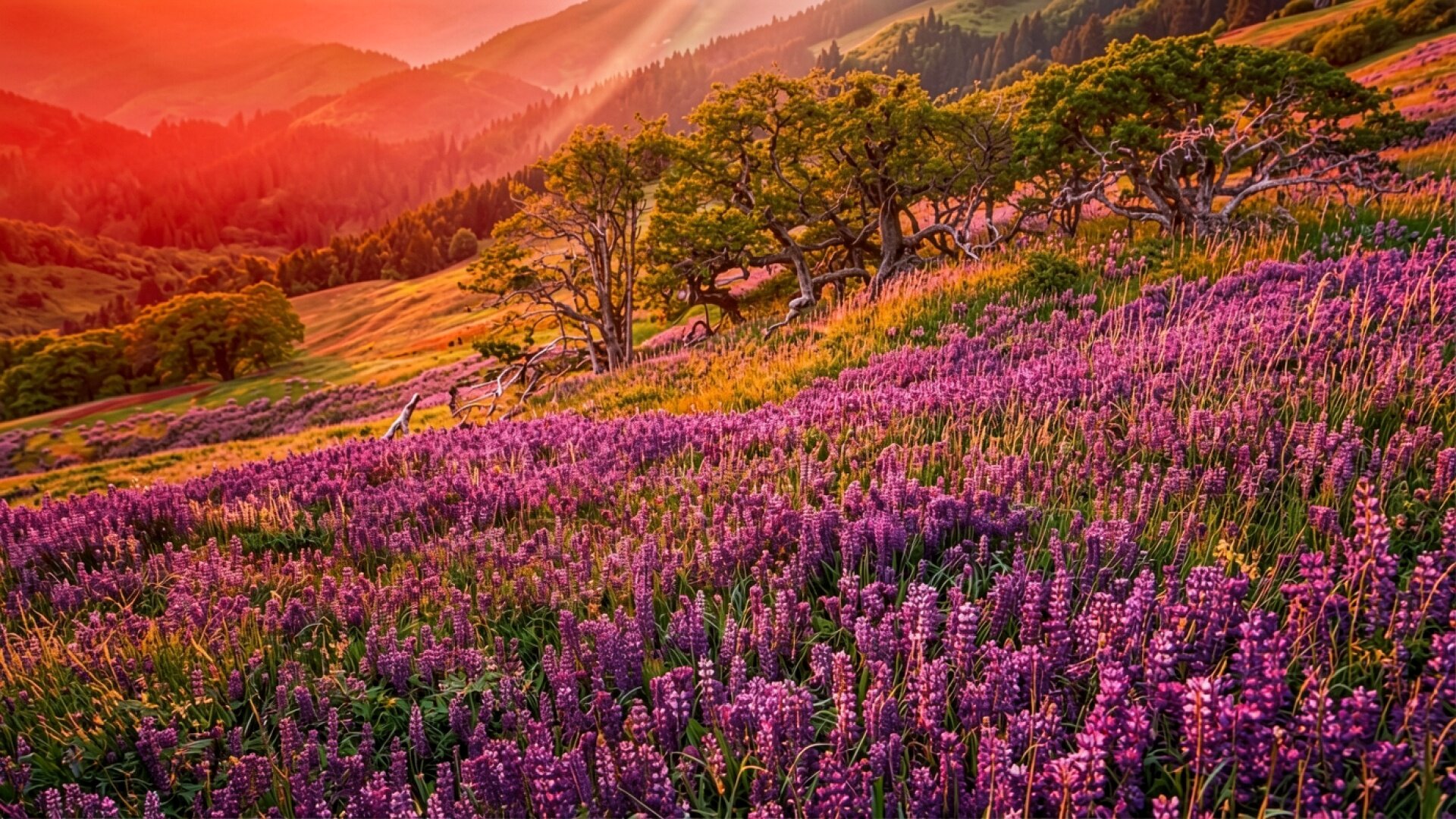 Поле фиолетовых цветов с деревьями закат