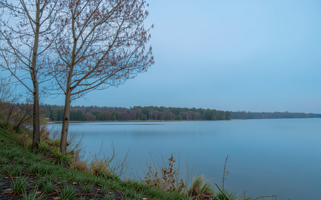 Осеннее озеро с голыми деревьями в сумерках