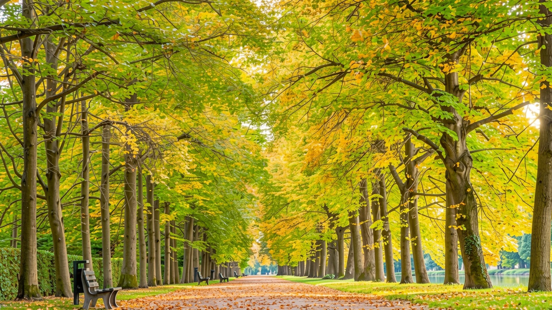 Осенняя аллея с желтыми деревьями и скамейками