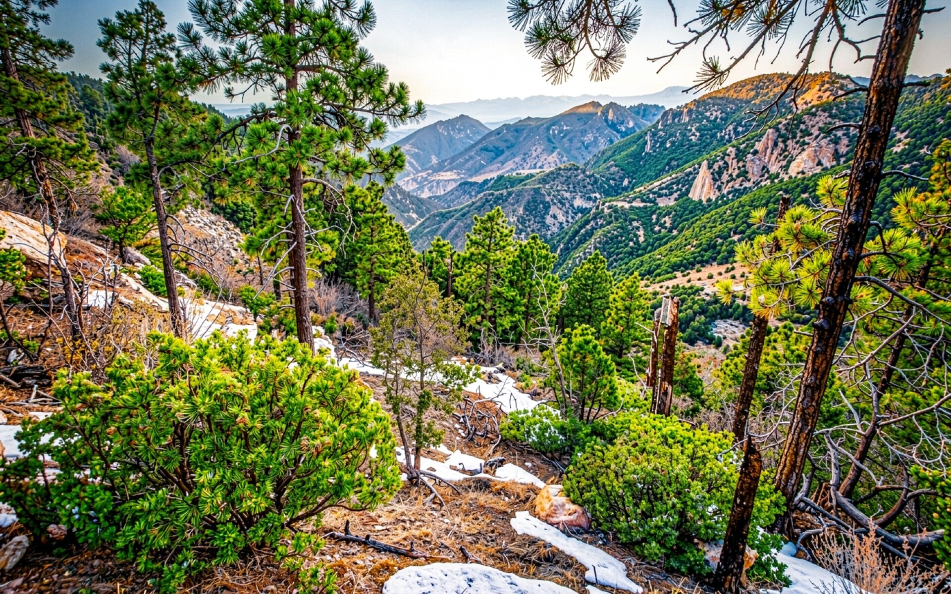 Горный пейзаж с хвойными деревьями и снегом