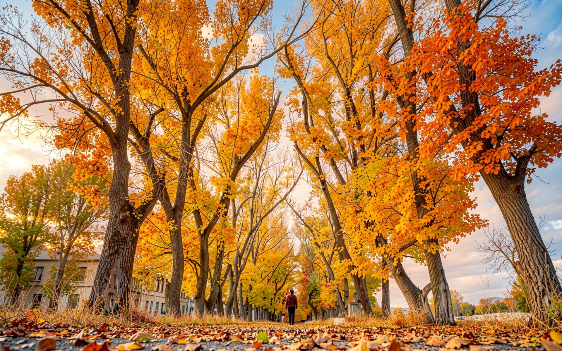 Осенний парк с желтыми деревьями и человеком