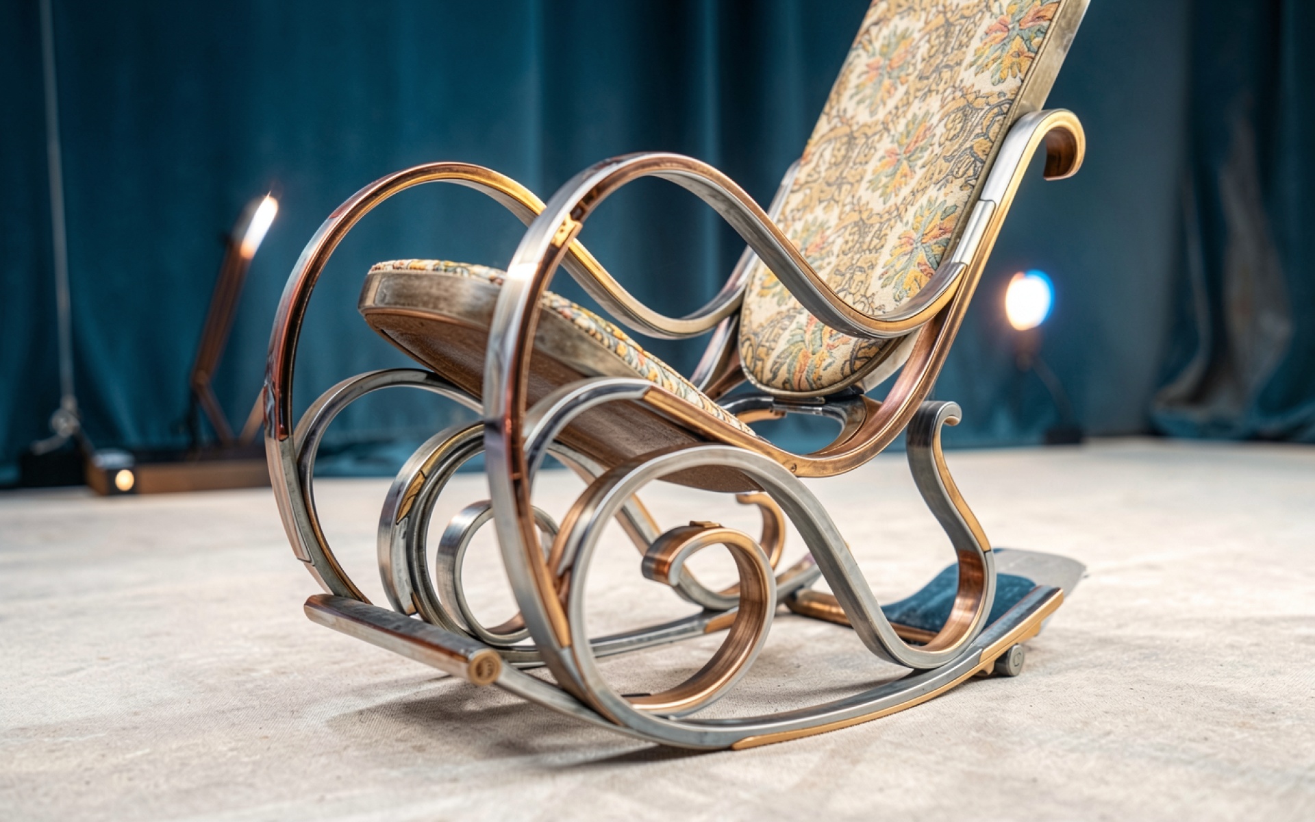 Деревянное кресло качалка в студии с синим фоном