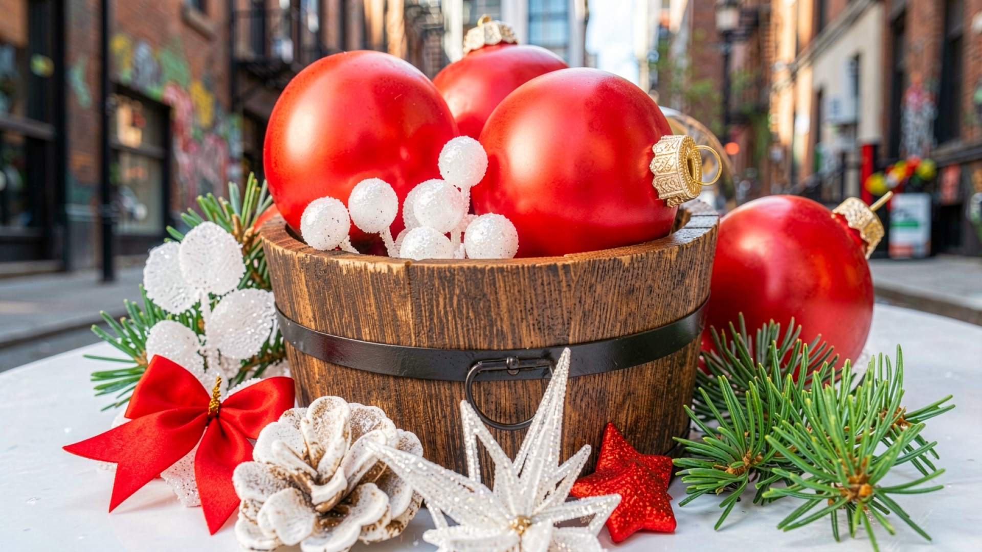 Красные елочные шары в деревянном ведре