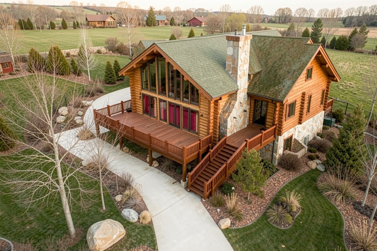 Деревянный загородный дом с террасой в сельской местности