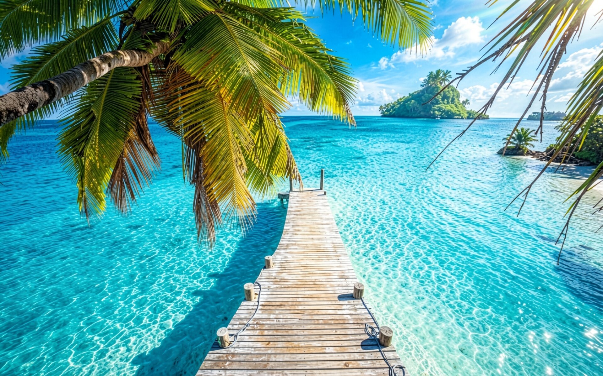 Деревянный пирс на тропическом пляже с пальмами