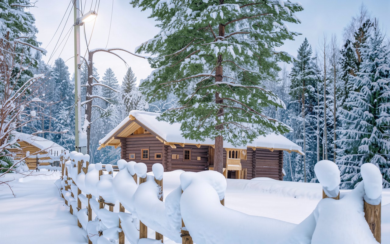Деревянный сруб в заснеженном хвойном лесу