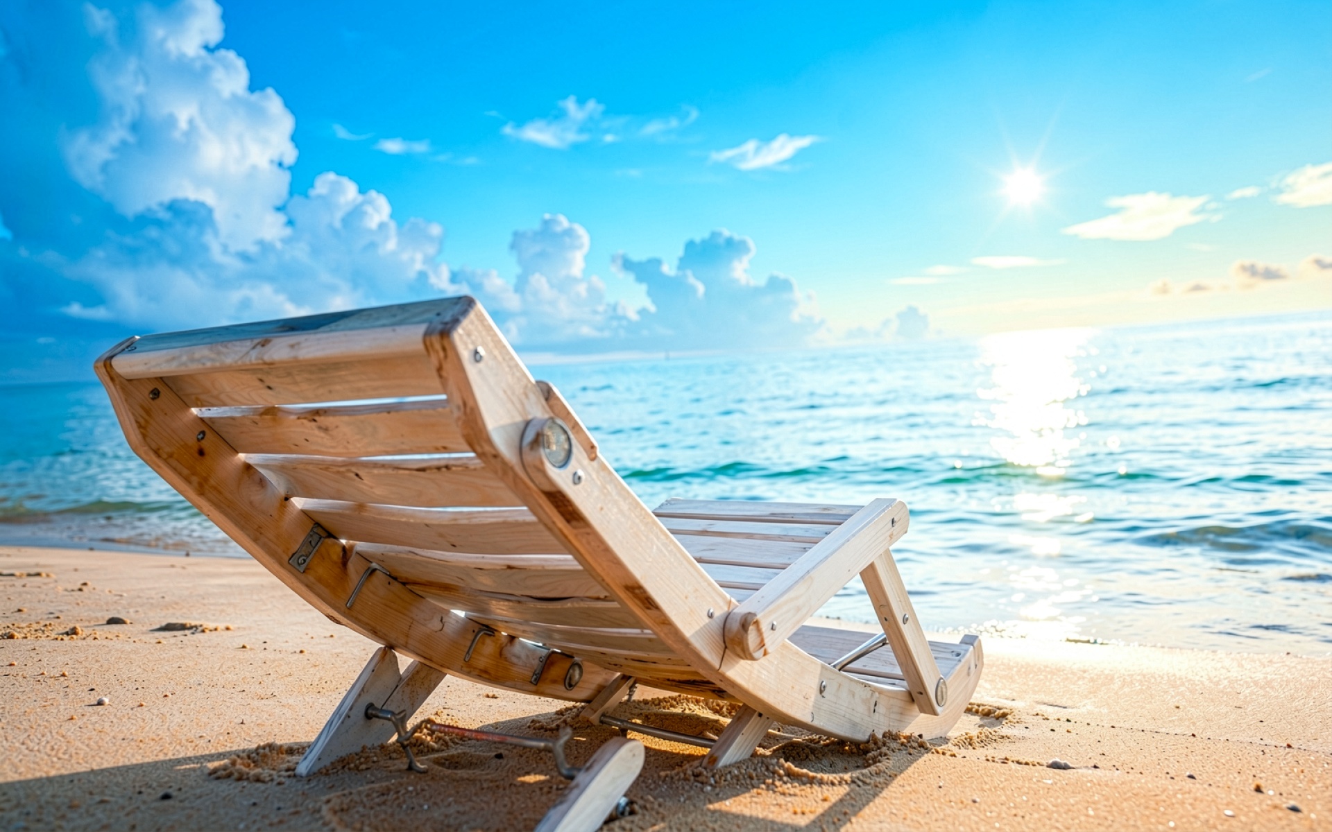 Деревянный шезлонг на солнечном песчаном пляже
