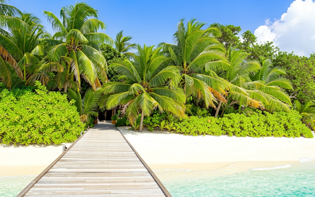 Тропический пляж с пальмами и деревянным пирсом