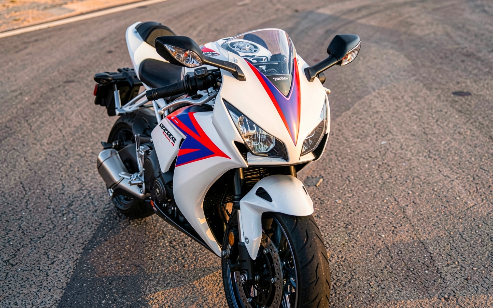 Белый спортивный мотоцикл с красными деталями на дороге