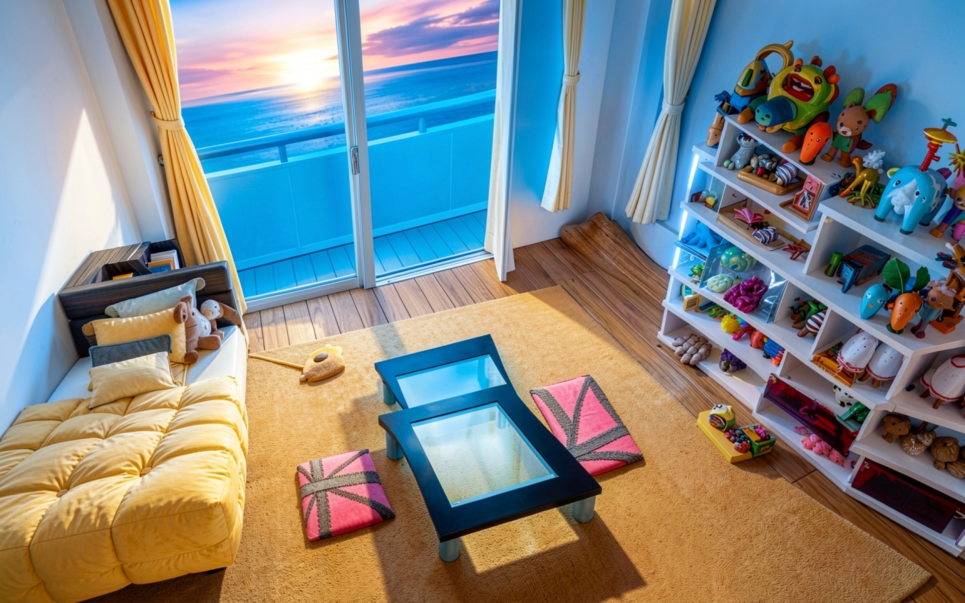Детская комната с игрушками при закате