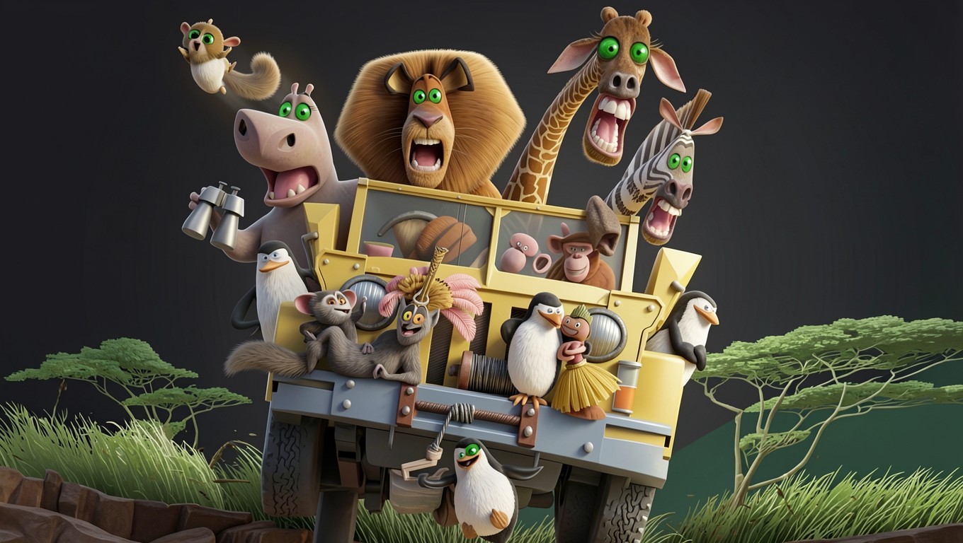 Персонажи Мадагаскара в желтом джипе сафари