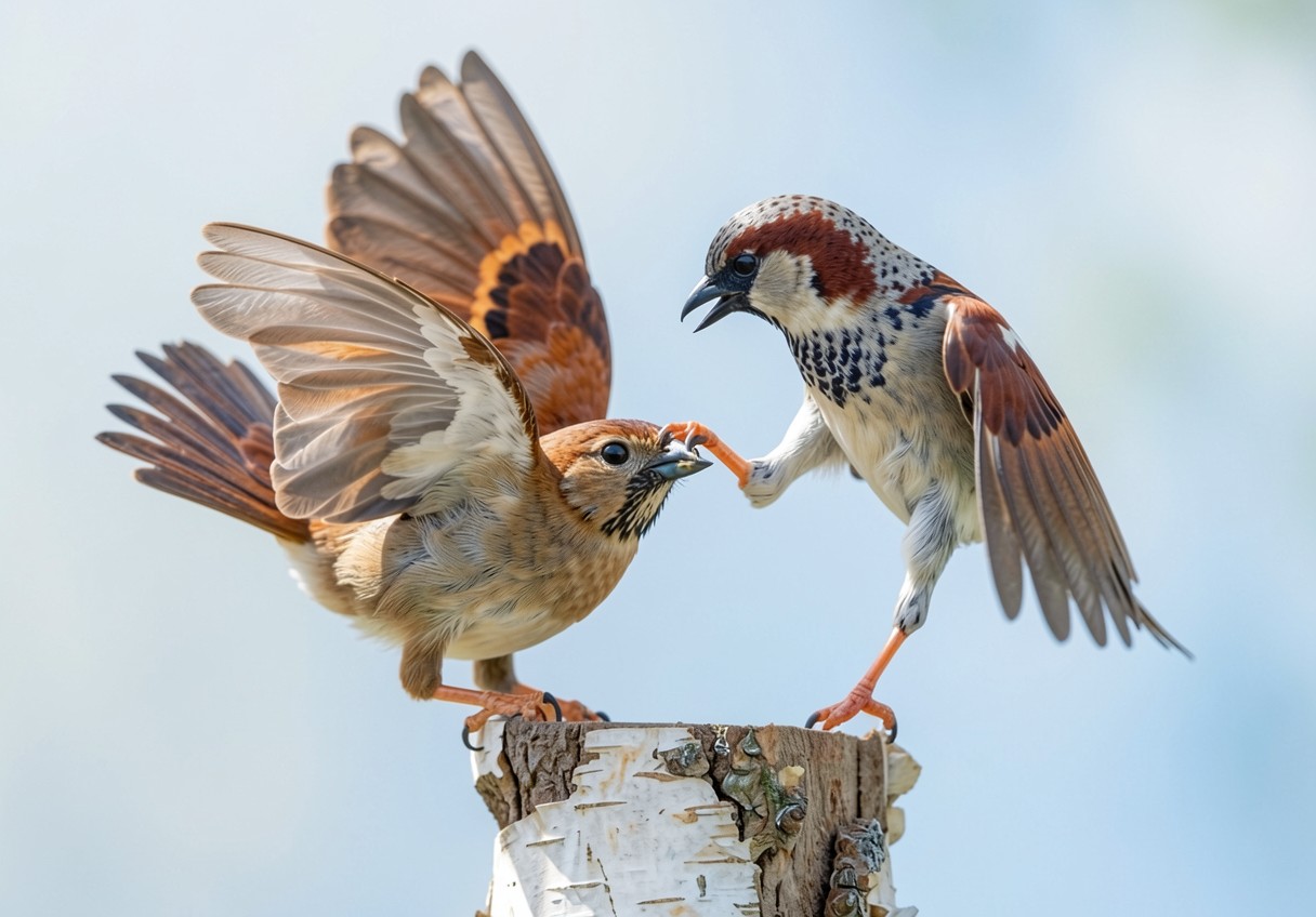 Два воробья на березовом пне при дневном свете