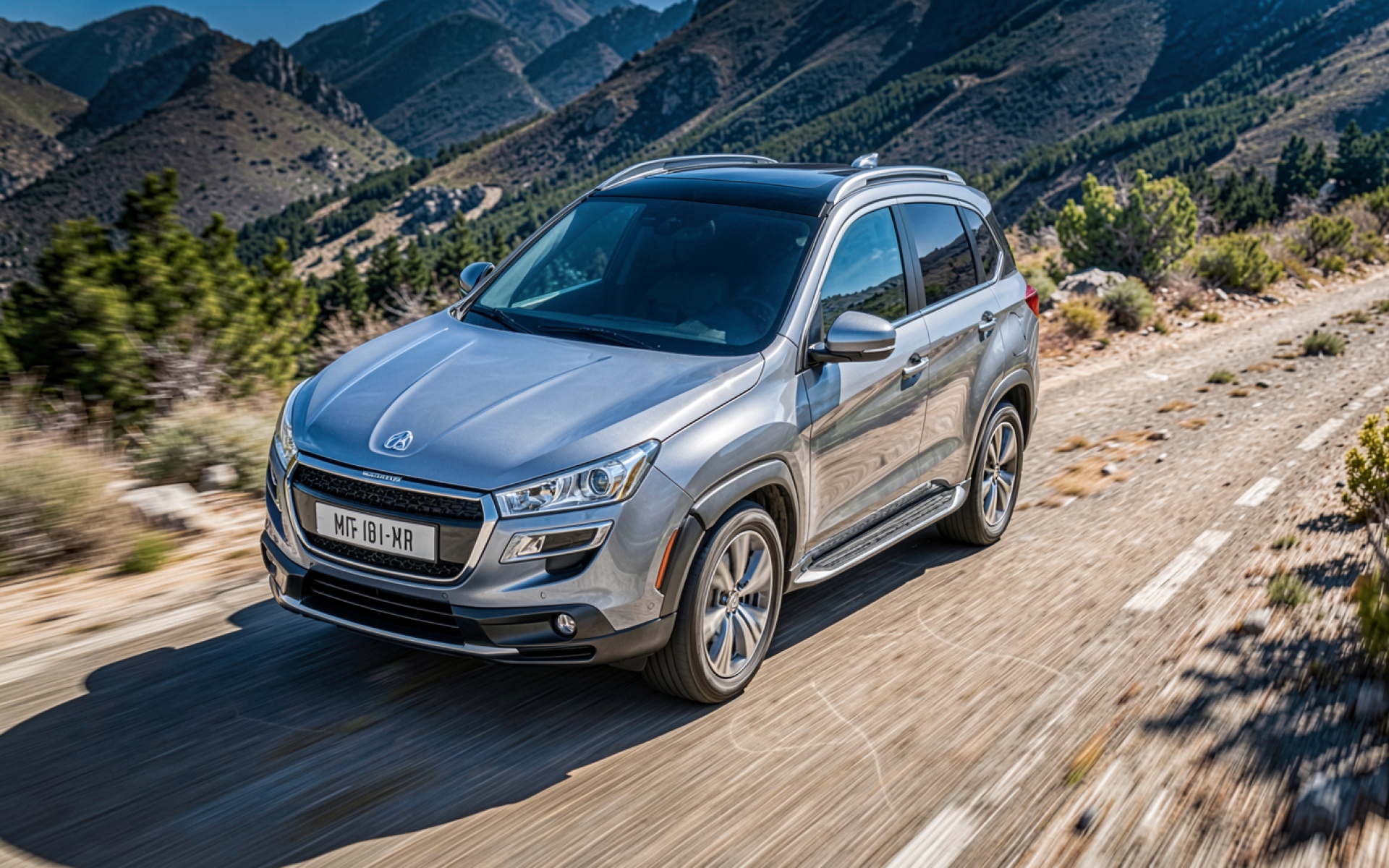 Серебристый кроссовер на горной дороге днем
