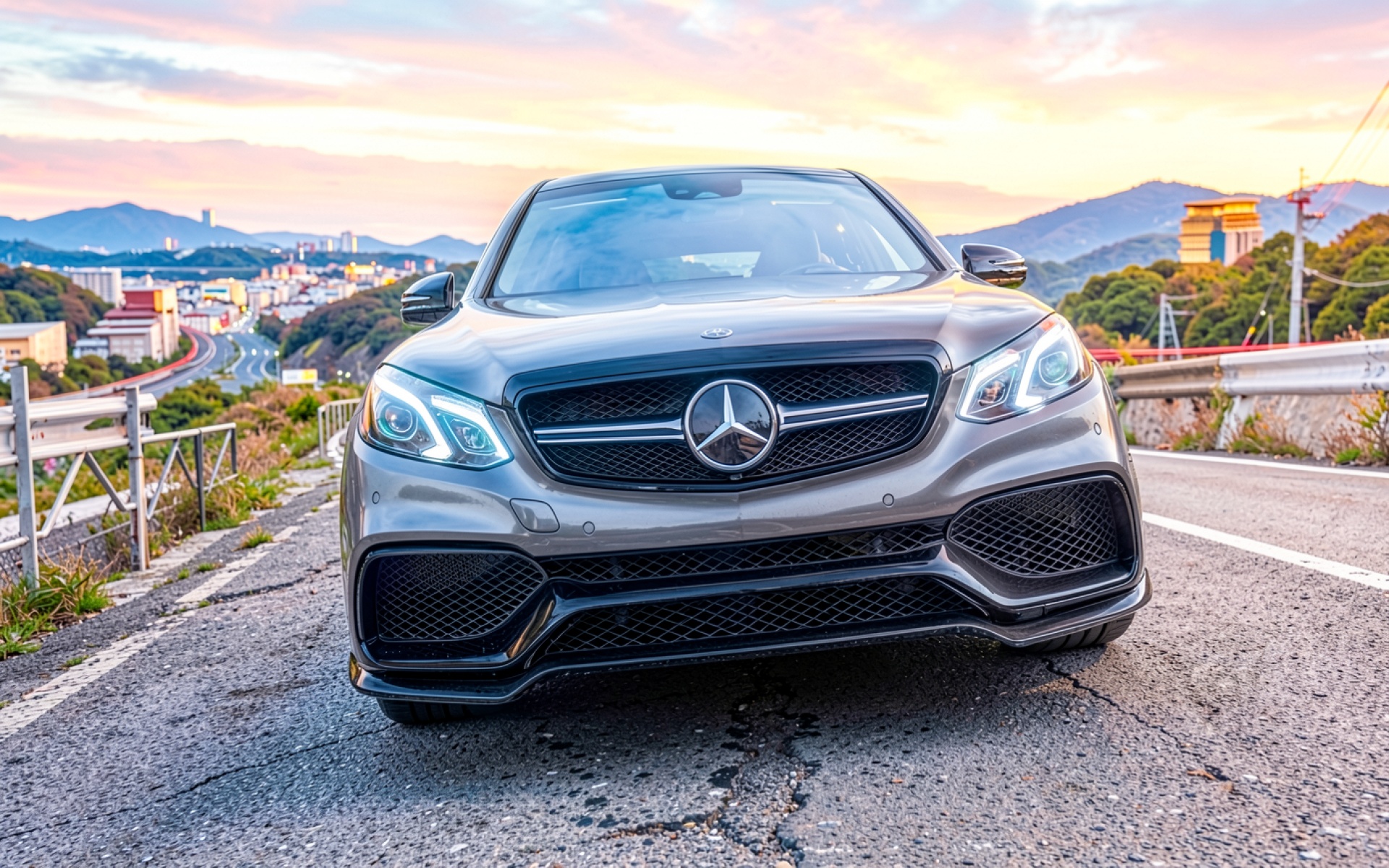 Серый Mercedes AMG на горной дороге закате