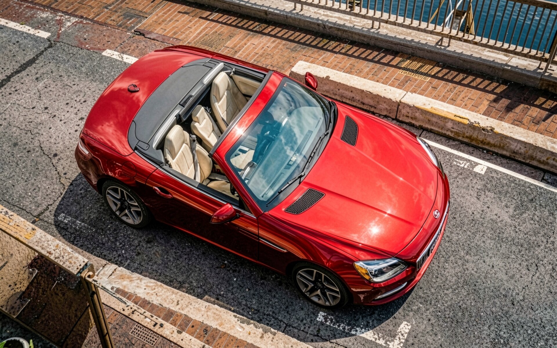 Красный кабриолет на городской дороге сверху