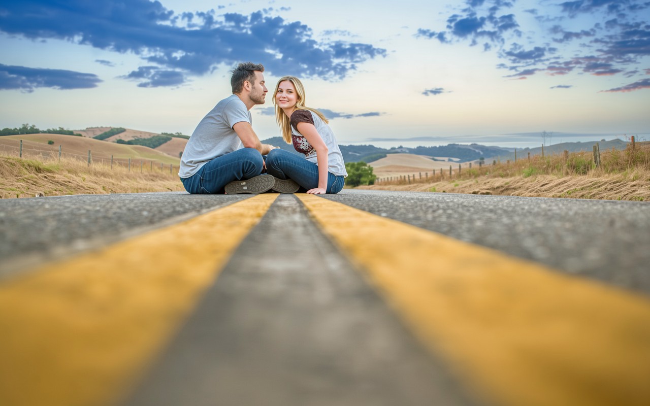 Влюбленная пара на загородной дороге в сумерках