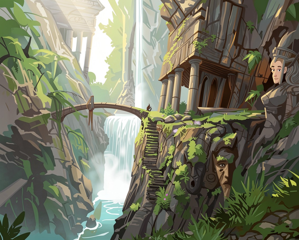 Древний храм в джунглях с водопадом