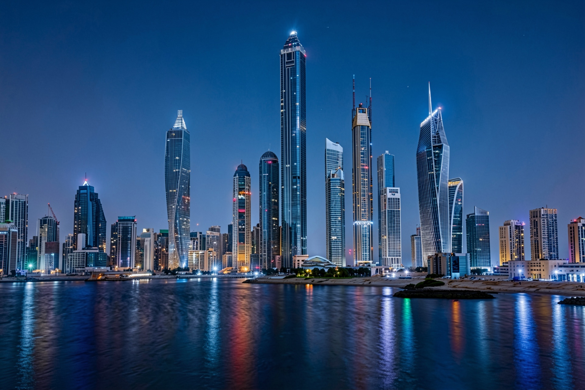 Ночной панорамный вид небоскребов Дубая синий