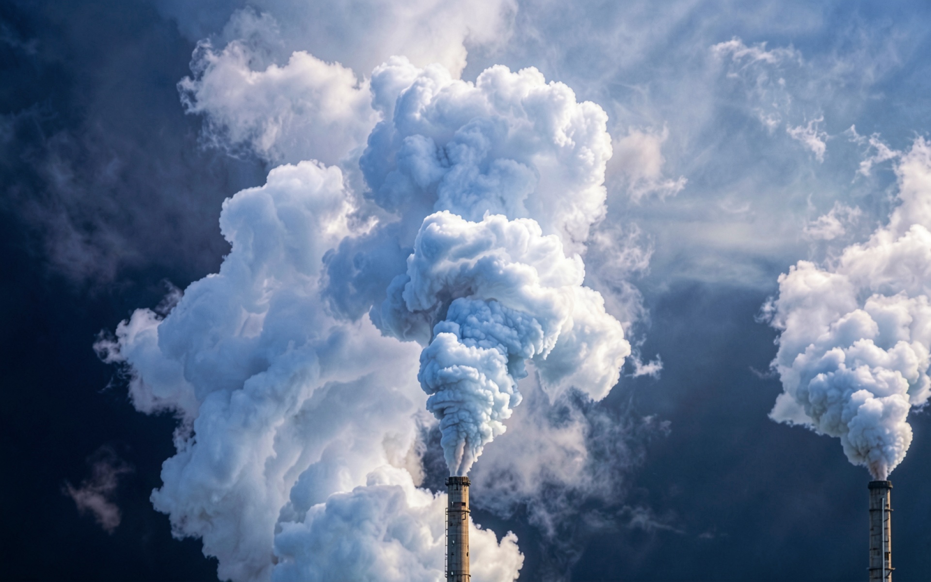 Дымящие заводские трубы в синем сумеречном небе