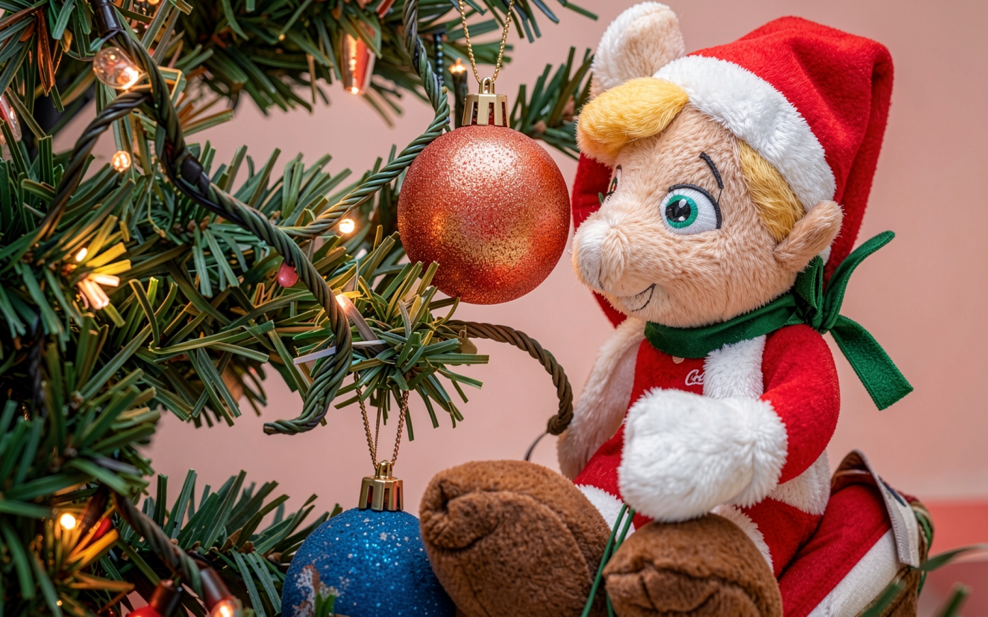 Рождественский эльф у наряженной елки в интерьере