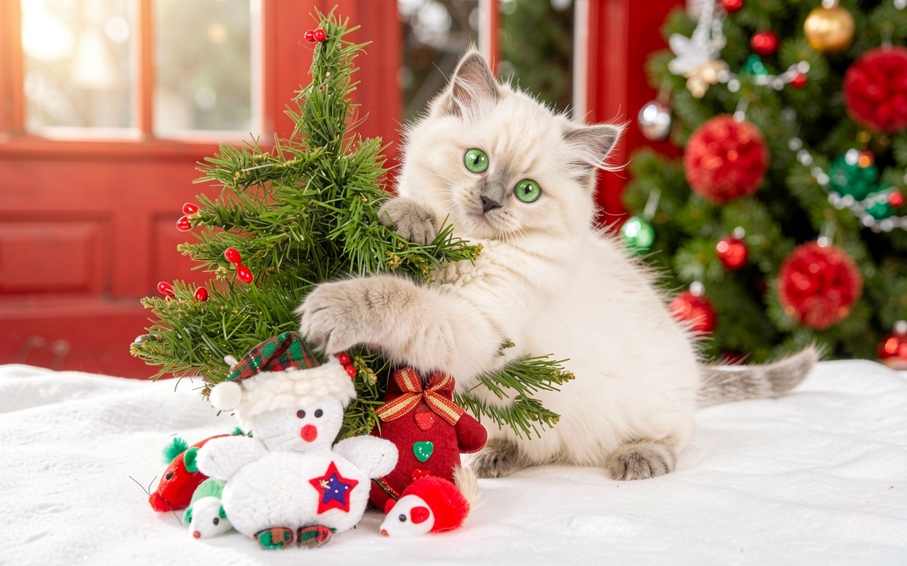 Белый котенок с новогодней елкой в интерьере