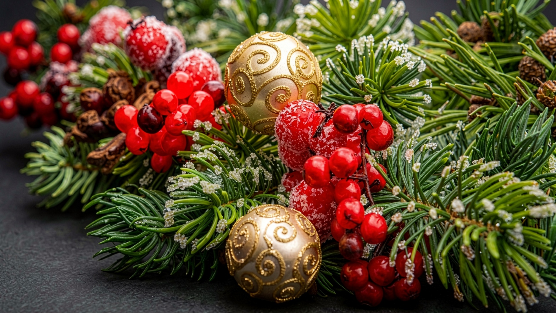 Рождественские еловые ветви с красными ягодами и золотыми шарами